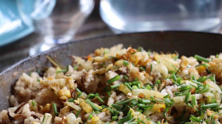 Sprinkle the chard and some fresh chives on top of the rice before serving.