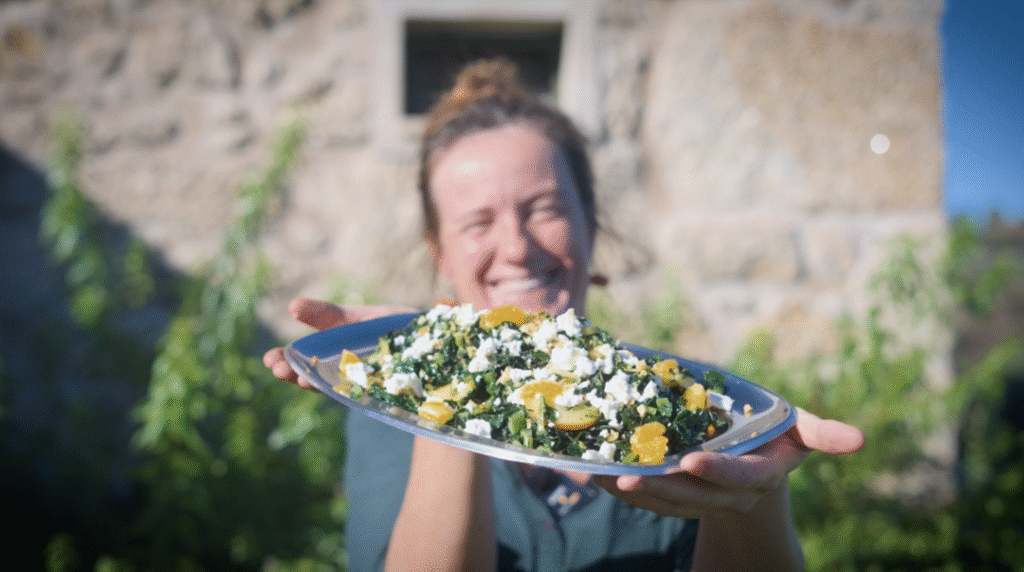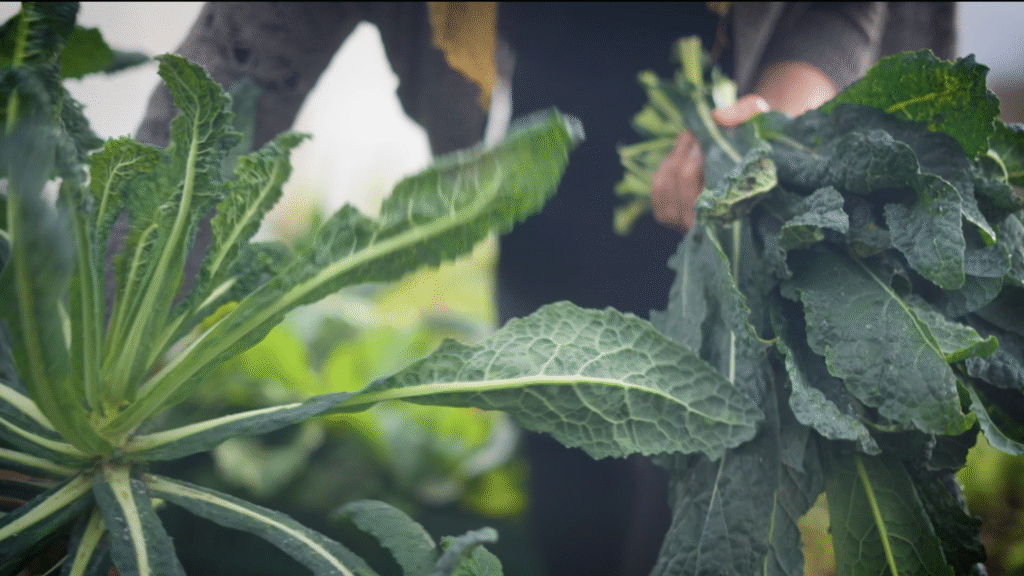 Palm cabbage—known as cavolo nero in Italian—is a deeply nutritious, iron-rich leafy green that becomes beautifully dark and glossy when sautéed. In this recipe, we balance its natural bitterness with warm slices of apple, salty feta, crispy garlic, and bright tangerine supremes. The result is a vibrant, fresh, and richly flavored side dish that brings life to any festive or winter table. It is simple, wholesome, and built entirely from real ingredients grown regeneratively on the farm.