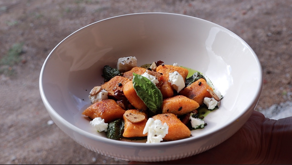 Add the basil oil onto a clean deep plate and gently place your gnocchi on top. Now decorate by adding chunks of feta, 3 dollops of the basil spread and sprinkle on walnuts, black pepper and some fresh basil. Voila, bon appetite!